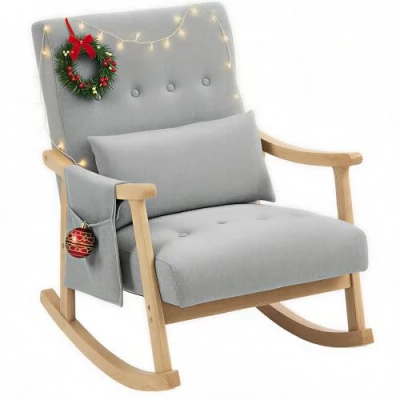 General description With a gentle rocking motion, the HOMCOM Modern High Back Rocking Chair provides soothing comfort whenever you need it. The chair features a strong rubberwood frame, ensuring durability and support, while the padded seat and back offer maximum comfort. The high, slightly angled back and arms provide ample support, and a convenient side pocket on the arm keeps smaller items within easy reach. Technical specifications Colour: Light Grey, Natural Wood Material: Cotton-Linen Fabric (100% Polyester), Foam, PP Cotton, Rubberwood Overall Dimension: 65W x 87D x 84H cm Seat Size: 58.5W x 56D cm Seat Height: 35-43H cm Backrest Size: 60L x 58.5W x 10D cm Armrest Size: 62L x 3.8W Armrest to Seat Height: 15H cm Pillow Size: 52L x 25W cm Side Pocket Size: 30W x 25H cm Weight Capacity: 120 kg Rocking Base Angle: 35° Usage The chair moves gently forwards and backward, providing a soothing motion that enhances relaxation. The thickly padded seat and back ensure comfort during use,
