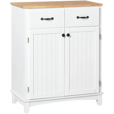 General description Refresh your home and add more storage space with this modern style sideboard from HOMCOM. Featuring two easy-slide drawers and a spacious cabinet, it provides ample room for storing utensils, cookware, kitchenware, and more. The durable MDF structure is complemented by a wooden countertop, offering a solid space for holding and even preparing food. Finished with black metal handles on the doors and drawers, this cupboard is both functional and stylish. Technical specifications Colour: White, Natural Material: MDF, Rubber Wood Overall Dimension: 74L x 40W x 94H cm Cabinet Inner Dimension: 69.5W x 36.5D x 60H cm Drawer Inner Dimension: 27W x 28.5D x 10.5H cm Weight Capacity: 50 kg (total), 20 kg (top), 10 kg (shelf), 5 kg (drawer) Item Label: 835-277 Usage This cupboard is perfect for storing small kitchen appliances such as coffee machines, blenders, mixers, and more. Its modern design makes it suitable for various spaces including the kitchen, living room, dining