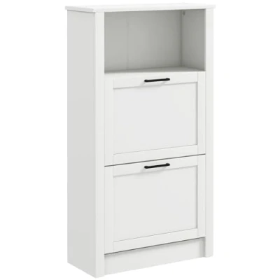 General description The HOMCOM Modern Shoe Cabinet is an essential furniture piece designed to help you organize your shoes and belongings efficiently, even in limited spaces. Featuring two-tier flip drawers, this cabinet offers ample storage capacity for your footwear. The adjustable shelves allow you to customize the interior to accommodate ankle boots and tall high heels, while the open shelf and countertop provide additional space for displaying keys, photo albums, and plants. Technical specifications Colour: White Materials: MDF Overall Dimensions: 58W x 24D x 105H cm Compartment Size: 55W x 23D x 26H cm Drawer Inner Size: 47W x 25D x 30H cm Storage Capacity: 10 Pairs Max Shoe Size: UK 9.5 Weight Capacity: 40 kg (overall), 10 kg (top/compartment), 10 kg (drawer) Item Label: 837-413V80WT Other information Features an open compartment and two flip drawers for up to 10 pairs of shoes Adjustable and removable shelves for different shoe heights MDF board structure with a smooth