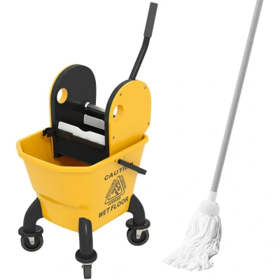 General description Make floor cleaning quicker and easier with this HOMCOM mop bucket and wringer. The 26 litre capacity provides ample room for water and cleaning chemicals, allowing you to clean multiple areas in one go. The top removable wringer efficiently removes excess water from the mop, promoting quicker and safer drying. Its bright yellow shell ensures high visibility, and the bucket is equipped with wheels for easy mobility. A mop is included for your convenience. Technical specifications Colour: Yellow Material: PP Plastic Bucket Capacity: 26 L Weight Capacity: 20 kg Overall Dimensions: 45W x 31D x 90H cm Wringer Dimensions: 22W x 25D x 34.5H cm Storage Basket Dimensions: 42W x 31D x 32H cm Item Label: 720-028V00YL Other information Mop included Excess water wringer can be removed for easy bucket filling before use Four wheels for easy movement Tough plastic body for durability Assembly required