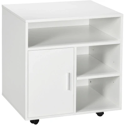 General description Optimise your office printing area with the HOMCOM Multi-Storage Printer Unit. This cabinet stand features a large tabletop for your printer, an open compartment for easy access to essentials, two open shelves, and a bottom cupboard with two shelves, keeping everything you need organized and out of sight. The inner shelf is adjustable to accommodate different height requirements. With four wheels for easy movement, two of which are lockable, this unit is designed for convenience and stability. Technical specifications Colour: White Material: Particle Board Overall Dimensions: 65.5H x 60W x 50D cm Top Compartment Size: 15H x 57W x 47.5D cm Top Cube Compartment Size: 18.5H x 27.5W x 45.5D cm Bottom Cube Compartment Size: 20H x 27.5W x 45.5D cm Cupboard Size: 39.5H x 28W cm Wheel Size: Ф4 cm Weight Capacity: 60 kg (Overall), 5 kg (Shelf) Item Label: 924-012WT Usage This printer unit is ideal for keeping shared office essentials organized and easily accessible. Its