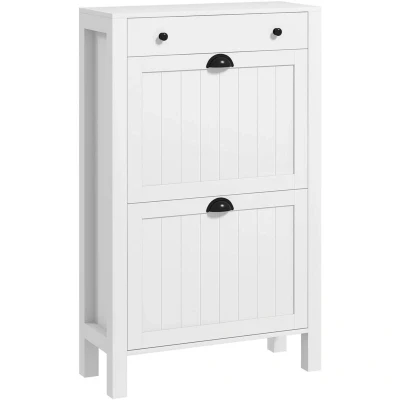 A shoe storage unit is an indispensable piece of furniture for every family. This slim shoe cabinet from HOMCOM lets you organise your shoes and belongings. The two-tier flip drawers provide a large storage capacity. You can store and display your keys, photo albums and plants in a pull-out drawer and countertop. Stop tripping over your family's shoes on the floor with this hallway shoe storage cabinet from HOMCOM. Specifications: ● Colour: White ● Material: MDF ● Overall Dimensions: 60W x 24D x 97H cm ● Flip Drawer Inner Size: 55W x 30.5D x 8.5H cm ● Top Drawer Inner Size: 49.5W x 18.5D x 6.5H cm ● Storage Capacity: 8 pairs of shoes ● Max Shoe Size: UK Size 8.5 ● Weight Capacity: 20 kg (overall), 3 kg (each shelf/drawer), 5 kg (top) ● Item Label: 837-390V80WT Features: ● Can store up to eight pairs of shoes ● Removable and adjustable shelves for larger footwear ● Elevated bottom for slippers ● Anti-tipping design ensures extra safety ● Assembly required