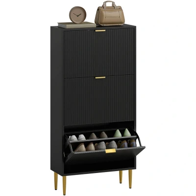HOMCOM Narrow Shoe Cabinet with 3 Flip Drawers, Modern Slim Storage Fluted Doors and Adjustable Shelves for Hallway, Holds 18 Pairs, Black