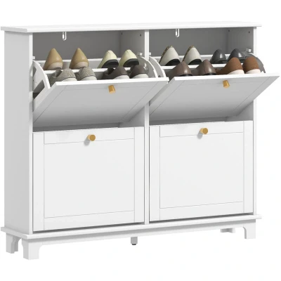 General description The HOMCOM Narrow Shoe Cabinet is designed to maximize storage in compact spaces. It features 4 flip drawers that provide easy access to your footwear while keeping them organized and out of sight. The cabinet's sleek white finish adds a modern touch to any entryway or hallway. Other information