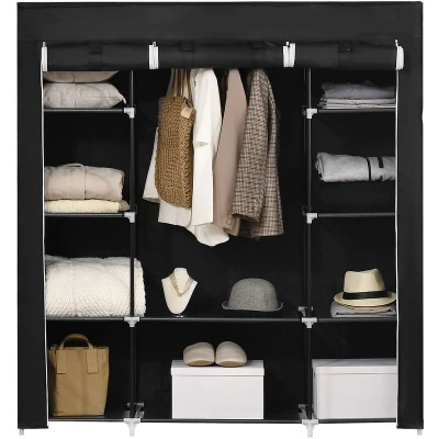 General description A cloth wardrobe is a versatile solution for any bedroom or living space, serving as both a temporary and permanent storage option. The HOMCOM Fabric Wardrobe features a hanging rail for longer garments and ten shelves for ample folded clothing storage. Technical specifications Colour: Black Material: Steel, Non-woven, PP Overall Dimensions: 150W x 43D x 162.5H cm Left/Right Shelf Size: 39.5W x 39.5D x 37.5H cm Middle Shelf Size: 64.5W x 39.5D x 116.5H cm, 64.5W x 39.5D x 37.5H cm Rod Length: 64 cm Rod to Right Top Shelf Height: 112 cm Leg Height: 5 cm Weight Capacity: 55 kg (total), 5 kg (each layer), 15 kg (hanging rod) Usage The wardrobe is designed for storing clothing and accessories, providing a fabric cover for protection and roll-up zipped doors for easy access. Its elevated base allows for easy cleaning underneath. Other information Easy to set up and take down Strong powder coated steel frame for support