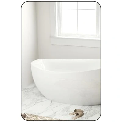 90 x 60cm curved rectangular shape: Bathroom mirror is a beautiful and smoothly curved piece. Size offers plenty of reflection room to see yourself. HD, shatter-resistant glass: Copper-free mirror provides a bright, clear reflections to see yourself properly. Shatter-resistant film on the back for safety. Metal frame: Powder coated for extra strength, this bathroom wall mirror is strong and robust. Safe rounded corners for a soft look. Horizontal/vertical set-up, with wall-mounting accessories: Hang black bathroom mirror the way you want. Everything you need in one package. Dimensions: 90H x 60W x 2.5D cm. Glass thickness: 0.4 cm. No assembly required.