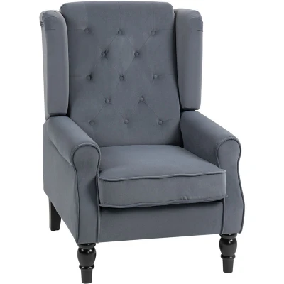 HOMCOM Retro Accent Chair, Velvet Wingback Armchair with Wood Frame Button Tufted Design for Living Room Bedroom, Grey