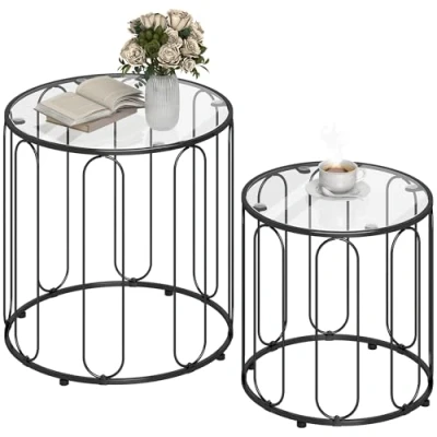 HOMCOM Round Coffee Table Set of 2, Glass Nest Tables with Metal Frame and Tempered Tabletop for Living Room, Black