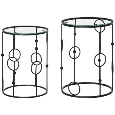 A striking frame design, paired with the sleek black colour, makes these two side tables a glamorous addition to your home. The frames, made from metal, are crafted into a cool hoop and ball design, covered in water-resistant paint for extra protection. The table tops are made from safe tempered glass to offer a solid and sleek resting place. Set comes with a big table and q smaller, allowing you to neatly tuck the latter into the larger table for excellent space-saving. Specifications: ● Colour: Black ● Material: Metal, Tempered Glass ● Big Table Size: Φ41 x 57H cm ● Small Table Size: Φ36 x 51H cm ● Tempered Glass Thickness: 5 mm ● Weight Capacity: 30 kg ● Item Label: 833-674V00BK Features: ● Two-piece set, great using together or by themselves. Great for accent table, side table or coffee table● Small table fits snuggly into the larger table to save space● Tempered glass table tops are solid and safe ● Sleek black metal frame, made into a cool hoop and ball design ● Maximum load 30