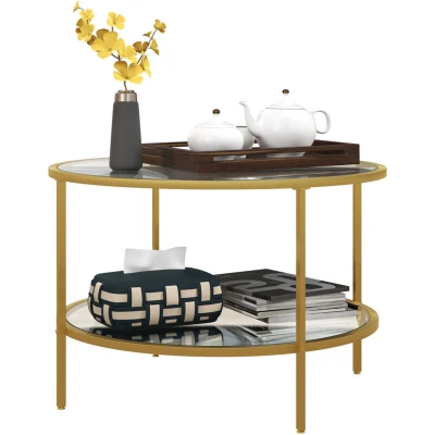 HOMCOM Round Coffee Table with Storage, 2 Tier Tempered Glass Steel Frame for Living Room, Gold Tone