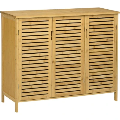 The entryway shoe rack is an indispensable piece of furniture for every family, but not every piece can meet your needs. This HOMCOM shoe storage cabinet with a 4-tier closed cabinet is specially built for you. You can adjust the upper and lower shelves to accommodate ankle boots and high heels. Also, you can store and display your keys, photo albums, etc. on the top shelf. Get your entrance tidy and clean with this beautiful and functional shoe storage cabinet. Specifications: ● Colour: Natural ● Material: Bamboo ● Overall Dimension: 100L x 35W x 80H cm ● Shelf Size: 61.6L x 31.2W cm, 30.8L x 31.2W cm ● The Height between Shelves: 16 cm ● Leg Height: 8 cm ● Storage Capacity: 16 pairs of shoes ● Max Shoe Size: EU Size 46 ● Weight Capacity: 60 kg (total), 20 kg (top), 5 kg (each shelf) ● Item Label: 837-366V00ND Features: ● Bamboo frame with louvre doors evokes rustic style and allows good ventilation ● 8 shelves total inside the cabinet can store up to 16 pairs of shoes(EU46) ●