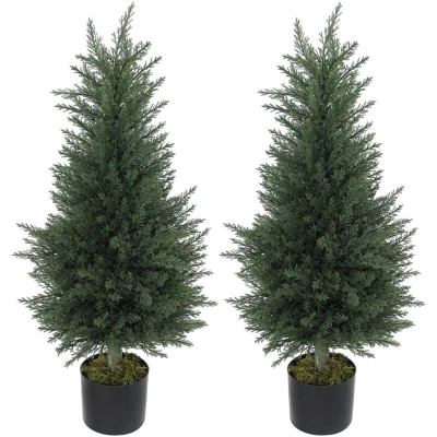 HOMCOM Set of 2 Decorative Artificial Plant, 90 cm Cypress Tree with 362 Leaves in Pot, UV Resistant Plastic Fake for Indoor Outdoor Home Office
