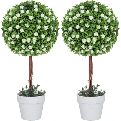 HOMCOM Set of 2 Decorative Artificial Plants, Ball Topiary Tree with Rose Flower in Pot, Fake Plants for Home Indoor Outdoor Decor, 60cm, White