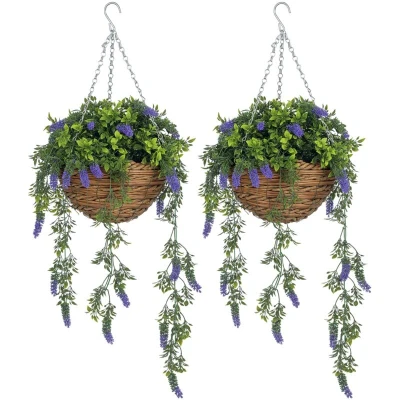 Transform your living space with the enchanting HOMCOM set of two hanging baskets filled with faux lavender flowers. These exquisite artificial plants boast UV protection, making them suitable for both indoor and outdoor use, while their natural textures and vibrant colours create an impressively realistic appearance. Enjoy the beauty of greenery year-round without the hassle of upkeep, all while elevating your décor with their evergreen elegance.