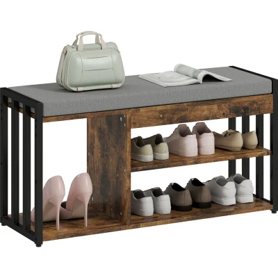 Organise footwear with our HOMCOM shoe hallway bench. With two open shelves, there's room for six pairs of your shoes, with a tall side shelf for boots it's great for personal use. It features a top padded seat - sit comfortably for a moment as you put shoes on and take them off. With a steel frame, this shoe storage with seat has a strong, supportive core. Suitable for everyday. Specifications: ● Colour: Rustic Brown, Grey ● Material: Particleboard, Steel, Linen-Look Fabric (100% Polyester), Sponge ● Overall Dimension: 90W x 30D x 45H cm ● Seat Size: 85W x 29D x 45H cm ● Large Shelf Size: 30W x 30D x 35.5H cm ● 2-Tier Shelf Size: 54.5W x 30D x 13H cm (top), 54.5W x 30D x 13H cm (bottom) ● Weight Capacity: 120 kg (seat), 8 kg (each shelf) ● Item Label: 837-342V70RB Features: ● Two-tier shelf: each tier holds three pairs of shoes each ● Tall shelf for boots ● Top padded seat to take shoes on and off comfortably ● Steel frame and particle board structure. Durable and sturdy ● Removable