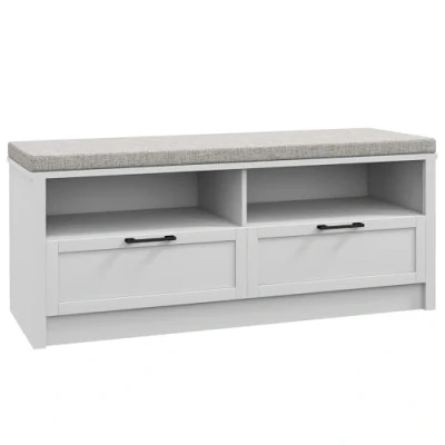 General description A compact and comfortable shoe storage bench from HOMCOM, designed for convenience in your hallway. It features two open compartments and two drawers, providing ample space for organizing your footwear and other small items. The padded seat allows you to sit comfortably while putting on or taking off your shoes. Technical specifications Colour: White and grey Materials: MDF, Sponge, Linen Overall Dimension: 110W x 34.3D x 46H cm Seat Size: 110W x 34.3D cm Cushion Thickness: 4 cm Compartment Inner Size: 53W x 31D x 15H cm Drawer Inner Size: 45W x 25D x 11.5H cm Weight Capacity: 5 kg (drawer/shelf), 120 kg (seat) Item Label: 837-417V70WT Usage Each open compartment holds approximately five pairs of shoes. Two drawers provide additional storage for small items. The removable cushion enhances comfort while using the bench. Other information Washable cover for hygiene. Sturdy MDF structure, ideal for everyday use. Maximum load capacity of 140 kg; assembly required.