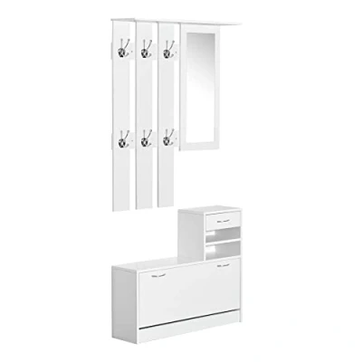 ManoManoGeneral description This HOMCOM Entryway Organizer Shoe Storage is an ideal solution for your entrance or hallway. This 3-in-1 system combines a shoe storage unit, a mirror for last-minute checks, and wall hangers for jackets and coats, making it a practical addition to any home decor. Technical specifications Material: Particleboard Colour: White Hanger Unit Dimension: 90W x 10D x 102H (cm) Shoe Storage Dimension: 90W x 24D x 75H (cm) Mirror Size: 25W x 70H (cm) Skirt Board Size: 8H x 86W (cm) Hanger Weight Capacity: 10kg Shoe Storage Weight Capacity: 30kg Net Weight: 27.5 kg Custom Label: 831-146WT Other information