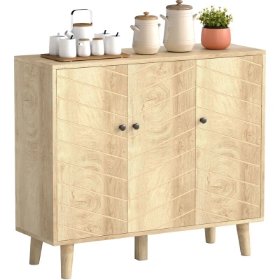HOMCOM Sideboard Cabinet, Modern Vintage Kitchen Storage Cabinet with 3 Chevron Doors and Pine Wood Legs for Living Room, Kitchen, Hallway, Natural Finish