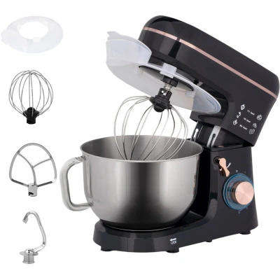 ManoManoGeneral description Unleash your inner baker with the HOMCOM Electric Stand Mixer, designed for baking enthusiasts. This powerful mixer features a robust 1400W motor and a handy six-speed setting plus pulse function, perfect for creating great meringues. Its tilt-head design simplifies bowl access, while the anti-slip base ensures stability during use. Complete with a 5L food-grade stainless steel bowl, this mixer is an essential companion for any cake mixer enthusiast. Technical specifications Colour: Black Material: Stainless Steel, Plastic, Aluminium Dimension: 41L x 26W x 32H cm Mixing Bowl Volume: 5L Power: 1400W Rated Voltage: 220-240V, 50/60Hz Cable Length: 1m Item Label: 800-251V70BK Usage Six speed and pulse settings offer versatile mixing options Includes whisk, dough hook, and mixing beater for diverse tasks Clear splash guard keeps kitchen surfaces clean Handle for easy operation Other information The bowl, whisk, dough hook, and mixing beater are dishwasher safe; the