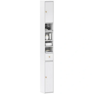 General description This HOMCOM Tall Bathroom Cabinet is designed to maximize your space while providing ample storage. Its slim profile allows it to fit perfectly into smaller areas, featuring two closed cabinets, a drawer, and four open compartments. The adjustable shelves make organization easy, ensuring everything has its designated place. Additionally, the cabinet includes anti-tipping features for added security. Technical specifications Colour: White Materials: Particleboard Overall Dimension: 20W x 20D x 178H cm Cabinet Inner Size: 17.5W x 18D x 40H cm (top), 17.5W x 18D x 60.2H cm (bottom) Open Compartment Size: 17.5W x 18D x 16.4/15.9/10/10.3H cm Drawer Inner Size: 12.5W x 14.7D x 11.5H cm Weight Capacity: 50 kg (total), 5 kg (shelf/drawer) Item Label: 834-781V91WT Usage Closed and open areas help keep your bathroom tidy and organized. Three adjustable shelves allow customization of storage to fit your needs. The slim yet tall design is ideal for narrow bathrooms. Anti-slip