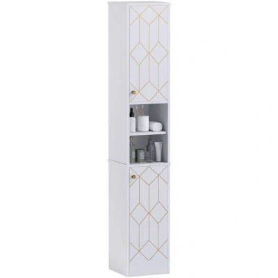 General description Maximise your bathroom's charm and storage with HOMCOM's tall bathroom cabinet. Featuring two two-tier cabinets and open compartments, this cabinet allows you to adjust your storage space with three-level shelves to suit your needs. The modern design boasts gold tone geometric elements and chic round handles, blending functionality with style in any bathroom setting. An anti-tipping design ensures safety and stability. Technical specifications Colour: White Material: MDF Overall Dimension: 30W x 30D x 170H cm Cabinet Inner Size: 25.5W x 25D x 56H cm Open Compartment Size: 25W x 26.5D x 20H cm Weight Capacity: 60 kg (total), 10 kg (each shelf) Item Label: 834-779V80WT Other information Modern design with gold tone elements adds aesthetic appeal Two-tier cabinets and open compartments for ample storage Adjustable shelves enhance organisational flexibility Tall and narrow design saves space in your bathroom Painted MDF surface ensures durability and easy maintenance