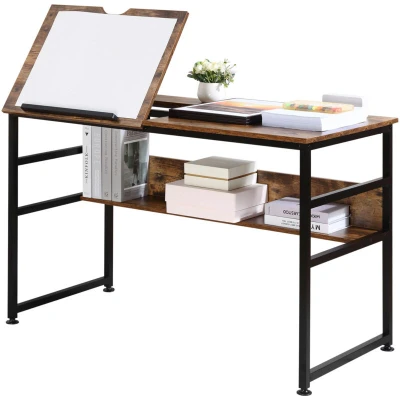 Homcom Tiltable Drafting Table Home Office Computer Desk w/ Shelf, Rustic Brown