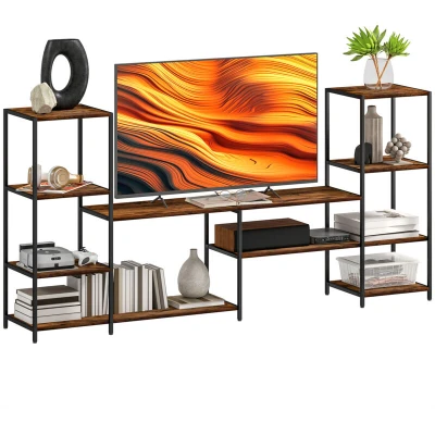 General description Transform your lounge with the HOMCOM TV console, a stylish hub for all your media essentials. This industrial TV stand features eight side shelves to display decor and store gadgets, along with a middle top designed to accommodate TVs up to 55 inches. Its steel frame ensures robust support, while adjustable screw-in feet adapt to uneven floors, providing stability and ease of cleaning. Capture the ambiance of a modern farmhouse with this TV console, which perfectly blends industrial black metal with a rich rustic finish. Technical specifications Colour: Rustic Brown Materials: Particle board, Steel Overall Dimensions: 192W x 33D x 93H cm Shelf Dimensions: 33W x 33D cm, 95W x 33D cm, 120W x 33D cm Weight Capacity: 80 kg (total), 30 kg (TV console), 5 kg (storage shelf) Item Label: 83B-383V01RB Installation Assembly is straightforward and can be completed with two people in approximately 15 minutes.