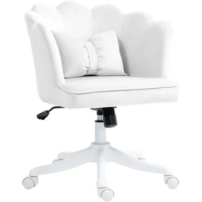HOMCOM Velvet Office Chair with Petal Shell Back and Lumbar Pillow, Armless Desk Wide Seat Tilt Function, Height Adjustable Swivel Makeup Vanity for Bedroom, White