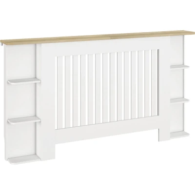 General description Tired of a cluttered room and an unsightly radiator? This HOMCOM radiator cover reclaims your space, offering side shelves and a top for decor. Its slatted design ensures warmth circulates effectively, creating a welcoming, organized, and cozy atmosphere for your family to enjoy every day. Technical specifications Colour: White Material: Particleboard, MDF Overall Dimension: 152W x 19D x 83H cm Inner Dimension: 102.5W x 15D x 81.5H cm Shelf Size: 20W x 11D x 26/25.8/26H cm Item Label: 820-496V01WT Usage Three-tier side shelves and spacious top shelf for display and storage Vertical slat design promotes efficient heat flow while concealing the radiator Rounded corners and anti-tip kit enhance safety and stability Installation Assembly required Pre-cut 16 cm base, allowing easy fit around skirting boards