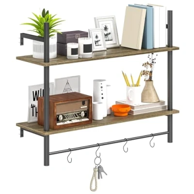 HOMCOM Wall Mounted Floating Shelves with 4 Hooks, Rustic for Living Room, Entryway, Grey