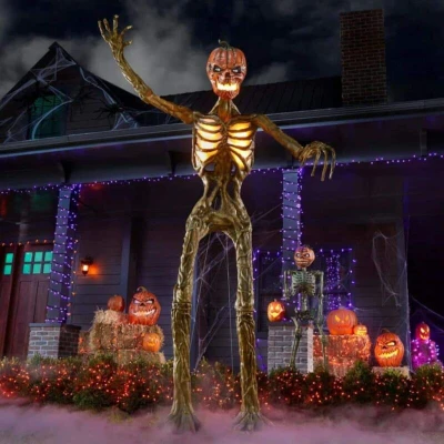 General description Prepare to take your Halloween decor to the next level with the Home Accents 12 foot Giant Inferno Pumpkin Skeleton. Standing at a towering 12 feet tall, this pumpkin skeleton is sure to be the center of attention in any spooky setup this Halloween, elevating the ambiance with its imposing presence. Featuring posable arms to suit your spooky vision and animated LCD life eyes, the skeleton gives a lifelike and unsettling presence, making it appear as though it is watching anyone who approaches. With a carved pumpkin skull, the skeleton's mouth and chest illuminate with an eerie, orange flame flickering effect, creating a haunting appearance at night. Crafted from durable plastic with intricate detailing, this tall decoration is designed for indoor and sheltered outdoor use, becoming the focal point of your haunted house. Technical specifications Height: 12 feet Power: Mains powered, 120V standard Plug type: 2 pin US plug Installation Requires assembly Includes a