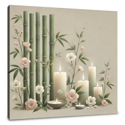 Home Art HavenThis serene illustration features lush green bamboo, softly glowing candles, and delicate flowers in muted shades. Perfect for creating a peaceful ambiance, it brings natural elegance and tranquility to any space.