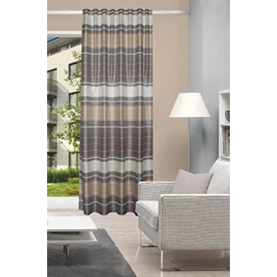 Modern curtain made from opaque decorative fabric with horizontal stripes, with high-quality effect fringes Box contents: 1x ready-made curtain Can be hung up using a combination band on any standard curtain rail and curtain rod Dimensions: 225 x 140 cm (height x width). Colour: natural Material: 100% polyester. Care: 30°C gentle cycle, iron on level 1 (without steam)