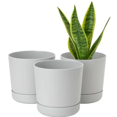 Home Garden Ornaments Classy Grey Plant Pots Indoor 15cm Diameter Set of 3 Plastic Pot with Integrated Saucer and Drainage Holes Flower Outside (Ø15cm, Grey)