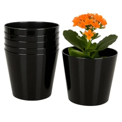 Home Garden Ornaments Plant Pots Indoor 6pcs Glossy Decorative Plastic Flower Pots, Vibrant (Black, 17cm / 6.7 in)
