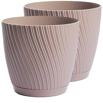Home Garden Ornaments Plant Pots Indoor Set of 2 with Drainage & Saucer Swing Pot Decorative Striped Flower Plastic Planter Design 5 Colours 6 Sizes (15cm, Taupe)