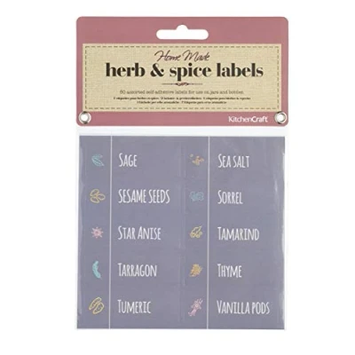 EASILY IDENTIFY SPICES AND HERBS, by using these self adhesive herb / spice labels to separate your cumin from your coriander IDEAL FOR HOME MADE STORAGE SOLUTIONS: these stickers are perfect for labelling loose spices from farmer's markets, or home-grown herbs PRETTY AND PRACTICAL, the labels have mini illustrations to match the text, so you can identify your spices and herbs at a glance EASY PEEL-SY: They couldn't be easier to use. Just peel from the backing card and stick! You get 5 food labels in the set and you can mix and match with others from the Home Made collection, by KitchenCraft