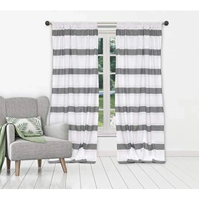 Heighten the drama of your elegant living room by adding these Namia Striped with Metallic Stripes Fashion Window Curtains. Their features include noise reduction, room darkening, energy saving insulation, and protection from harsh sunlight. Beautifully made, they'll frame your windows while keeping out unwanted light, making your living space even cozier. Hang them in your home today, and make them the focal point of any room you choose. Measures 40x84" (2 pieces) Features an easy to slide pole top for an elegant look, and easy to slide Elegant and updated Striped with Metallic Stripes design Includes 2 curtain panels