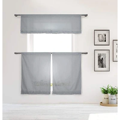 Bring a fresh, fashionable and elegant look to any room with this small kitchen window curtain featuring a fresh stunning Solid design. They will provide you the necessary privacy and allow just the right amount of light into any room. Each curtain made of jacquard fabric. Perfect for a kitchen, laundry room or guest bathroom. Measures 58x15" (1 Piece) 29x36" (2 Pieces) Included: (1) Valance & (2) Tiers Polyester Bring elegance to your home with these fashionable Solid Kitchen Curtain & Tier Set that will add a touch of elegance at the same time being practical. Provides privacy and filters light.