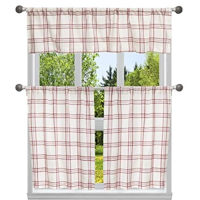 Home Maison Metallic Plaid Natural Kitchen Curtains and Valances Set, Garnet, 29x36