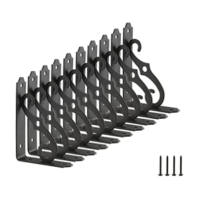 5 x 3-1/2 inch Decorative shelf bracket wall mounted shelf support brackets are made from high quality steel,durable ,sturdiness and long-lasting use 10 Pack decorative shelf brackets, elegant design compatible with any modern designed home decor.And floating shelf bracket helps create more space of wall for storage or display in any room Decorative shelf brackets come with mounting screws hardware so installation is quick and easy .Package include 10 Pack decorative shelf brackets,each bracket with 4 pcs screws This shelf bracket can able to hold up to 200 lbs. per pair,L shape structure of stable right angle, easy to make level and get rid of wobbles Decorative bracket can be used in kitchen,garages, basements, storage rooms, stores, offices, and factories. Perfect for bookbrack, clapboard, exhibition stand, elegant pattern design adds a touch off decorative style Screw usage recommendations: Use short screws for wooden boards and long screws for walls, Manufacturer: Home Master