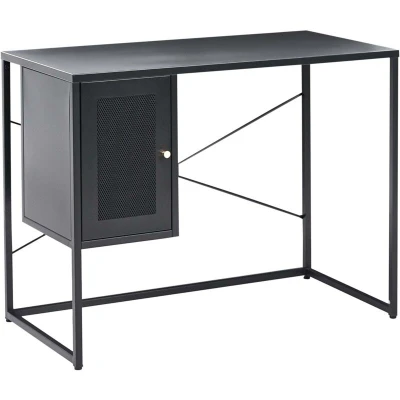 Office Cabinet with Open Shelves. Elevate your workspace with this modern office desk, a perfect blend of industrial edge and practical design. Built from high-quality powder-coated steel, it offers a durable and steady surface for your daily tasks while maintaining a minimalist silhouette. Featuring doors with a distinct mesh, the integrated storage compartment provides space for essential supplies, making this desk perfect for a home office or creative studio. Details: Product Type: Home Office Desk General Color: Black Frame Colour: Black Material Type: Metal Main Material: Steel Legs material: Metal Top Material: Metal Drawers: No Finish: Powder Coated Dimensions: Depth: 50 cm Width: 100 cm Height: 76 cm Weight: 12 kg Weight Capacity: 13 kg Offer Includes: 1 x Desk Key Features: Space Saving yet Providing Extra Surface, Modern Design, Great for Industrial Interiors, Stable and Durable Construction, Ideal for Home and Office Workspace, Leg Caps for Surface Protection, Additional