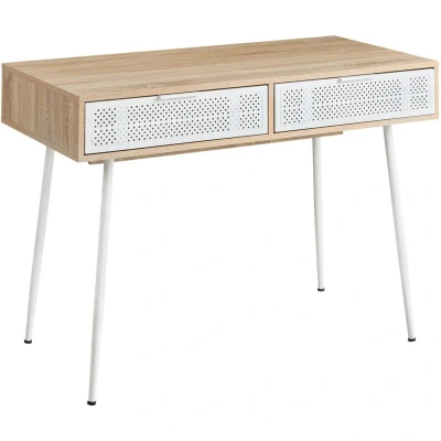 Modern Desk with Drawers. A wood-effect worktop paired with white perforated drawers gives this desk a distinctive design edge that works beautifully in any room of the home. Two generous full-width drawers keep your workspace clutter-free, while the tapered steel legs add a light retro-Scandinavian touch that never dates. Stylish enough for a living room, practical enough for a serious home office. Details: Product Type: Home Office Desk Style: Modern General Color: White, Brown Shade: Light Brown Material Type: Engineered Wood Main Material: Particle Board Additional Material: Steel Legs material: Metal Top Material: Engineered Wood Drawers: Yes Finish: Melamine Number of Drawers: 2 Dimensions: Depth: 52 cm Width: 110 cm Height: 76 cm Weight: 23 kg Weight Capacity: 40 kg Offer Includes: 1 x Desk Key Features: Practical Drawers with Stable Mechanism, Modern Design, Robust Frame, High Quality, Additional Storage Space Assembly Information: Full Assembly Required. 45-60 min. Additional