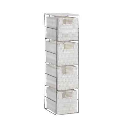CONTEMPORARY DESIGN: Keep your home clutter-free with this beautiful, modern 4-Drawer storage tower. The storage baskets are stylishly woven with natural seagrass. This is an ideal space-saving solution. DURABLE: This 4 storage basket tower is created using a robust and strong silver metal frame. The seagrass baskets, whilst being sturdy, are also lightweight which makes them easy to handle. AMPLE STORAGE: Featuring 4 storage drawers, perfect for storing away books, toys, video games, clothes and other handy items around your home. DIMENSIONS: Width 17cm, Depth 20cm, Height 65 cm. Designed to fit seamlessly into smaller spaces, providing efficiency without compromising on style. NO ASSEMBLY REQUIRED: Enjoy the convenience of our pre-assembled furniture. Simply unpack and place it in your desired location – no tools or setup needed!