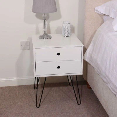 General description This modern styled Rydal white painted bedside cabinet features a 2 drawer design with finger apertures on angular black metal legs. The finish is an environmentally friendly water-based paint that is easy to clean and maintain, ensuring it looks as good as new. Technical specifications Width: 40 cm Depth: 40 cm Height: 54 cm Other information This item is also available in a light grey finish and a dramatic midnight blue/grey finish.