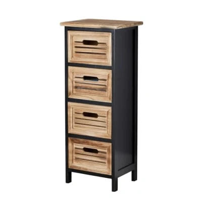 CONTEMPORARY DESIGN: Featuring a sleek black frame combined with natural wood-accented drawer fronts, offering a modern look with rustic charm that enhances any décor. QUALITY CONSTRUCTION: Crafted from strong, durable paulownia wood, this cabinet ensures long-lasting use. Each drawer features an easy-to-open hand hole slot for convenient access. SPACE-SAVING: Featuring 4 spacious drawers with ample storage to keep your belongings neatly tucked away, reducing clutter and enhancing the look of any room. DIMENSIONS: Measuring Width: 30cm, Depth: 25cm, and Height: 76.5cm, this cabinet effortlessly complements any room, from the lounge and dining room to the bathroom, bedroom, hallway, or home office. NO ASSEMBLY REQUIRED: Say goodbye to assembly hassles, as this cabinet comes ready to use - no assembly required. Simply unbox, and it’s ready to add a dash of charm to your space.