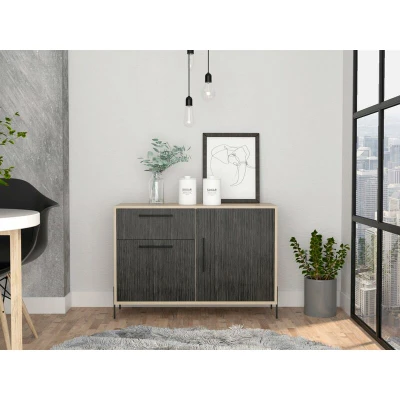 General description A compact sideboard with plenty of cupboard and drawer space, perfect for storing lounge and dining room essentials such as dinnerware and glasses. This Jasper compact sideboard combines functionality with style, featuring a mix of a drawer and two cupboards, both equipped with shelves for maximum capacity in a small space. Technical specifications Dimensions: Width 102 cm, Depth 39 cm, Height 70 cm Material: Easy to clean, hardwearing washed oak and carbon grey oak effect melamine finish Hardware: Real metal