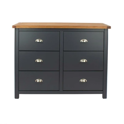 General description A real statement piece, this double wide chest features 6 drawers and is made using traditional materials and cabinet construction methods for easy assembly. It is finished in a luxurious dark carbon grey paint with an antique oak effect waxed hardwood framed top. The drawer boxes are made from hardwood and include drawer stops for safety, complemented by matt silver effect cup handles. Technical specifications Width: 110 cm Depth: 40 cm Height: 90 cm