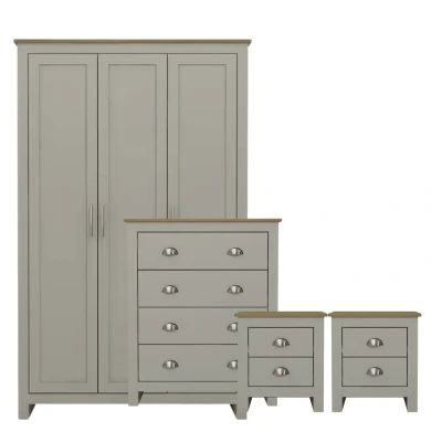 The Lancaster Bedroom Suite 4 piece set includes: 3 door wardrobe (x1) 4 drawer chest (x1) 2 drawer bedside cabinet (x2) Its easy to create a bedroom that showcases effortless chic, with this stylish four-piece furnishing suite. The design of this stunning collection exudes understated luxury. Comprising a three-door wardrobe, four-drawer chest and pair of very chic bedside cabinets, each piece is finished in cream, slate blue or grey foil with an oak top and brushed steel handles. An elegant suite, in a choice of 3 modern colours, incorporating storage and hanging space, creating a fresh, furnished new furniture suite suitable for a double room. Order now as we have very limited Lancaster Suite sets remaining SPECIFICATIONS 3 door wardrobe (W)1118 x (D)520 x (H)1800mm 4 drawer chest (W)790 x (D)395 x (H)950mm 2 drawer bed side cabinet (W)450 x (D)395 x (H)482mm