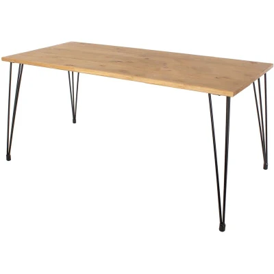 General description The Henley range combines solid wood and black stove painted metal hairpin legs to create on-trend industrial styling. The antique wax finish enhances the natural wood characteristics, ensuring that no two pieces are identical. This 150cm rectangular dining table comfortably seats six chairs—two on each side and one at either end—making it perfect for a casual living style in your dining room or as part of your living room furnishings. Technical specifications Dimensions: (W) 150cm (D) 75cm (H) 76cm